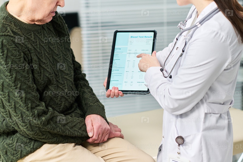 Мужчина консультирует взрослого женщину врач рассматривает результаты анализов крови