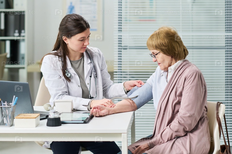 Женщина-врач измеряет кровяное давление пожилой женщины