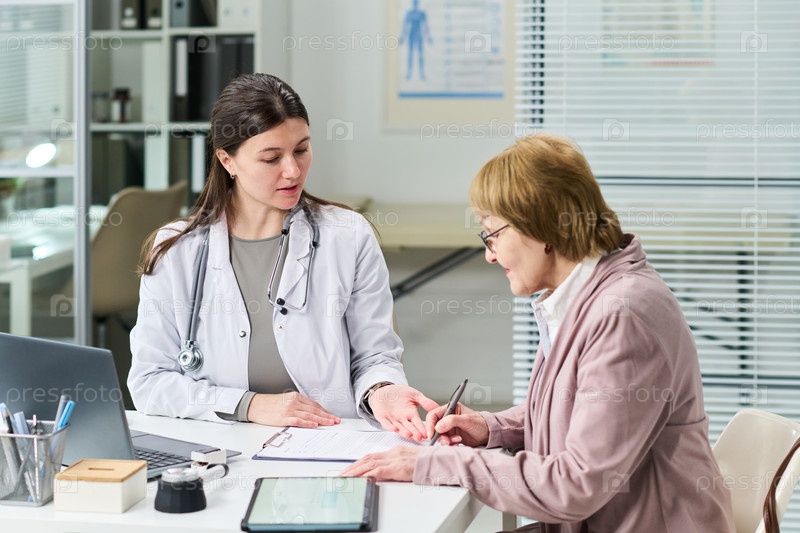 Старшая женщина подписывает форму медицинского согласия с присутствием женщины-врача