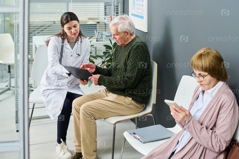 Врач-женщина консультирует старшего мужчину в клинике взрослых
