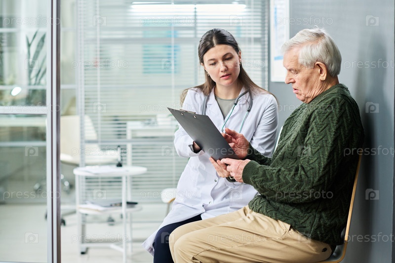 Женщина-врач объясняет медицинские результаты старшему мужчине