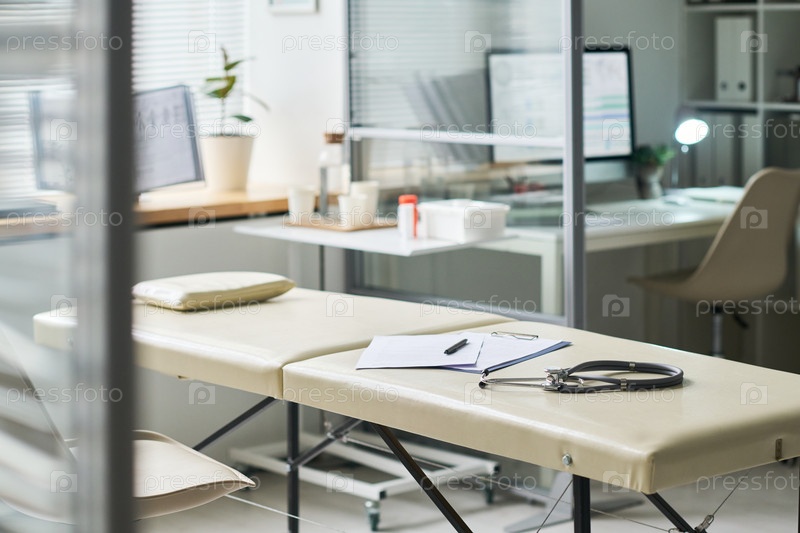 Пустой медицинский кабинет с стетоскопом и диаграммой пациента