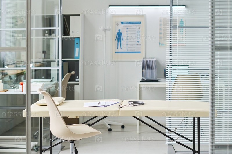 Пустой кабинет для медицинских осмотров с столом и экзаменационным столом в клинике