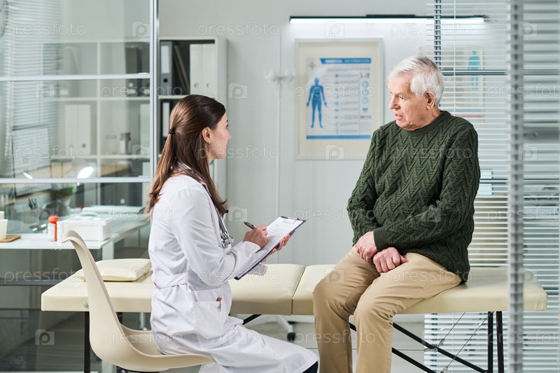 Старший мужчина консультирует женщину-врача во время медицинского осмотра