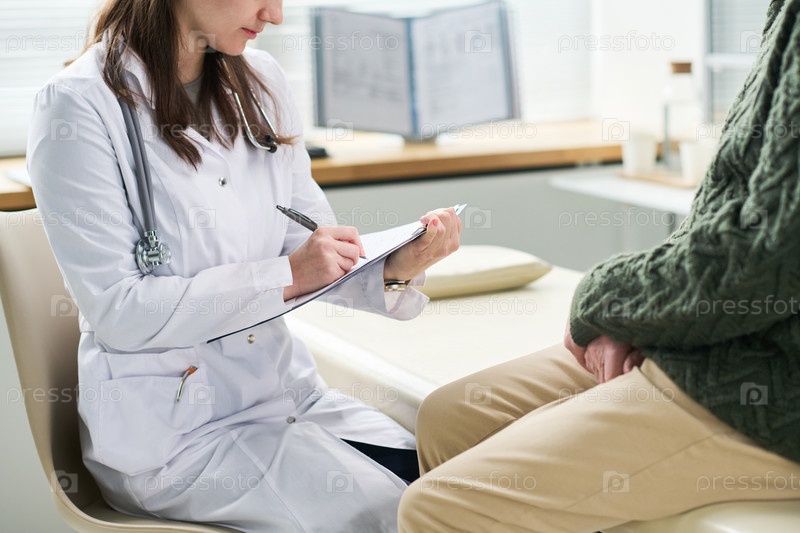 Женщина-врач, интервьюирующая взрослого мужского пациента в клинике