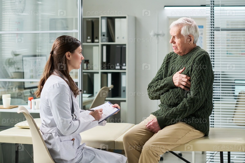 Старший мужчина описывает боль в груди женщине-врачу во время консультации