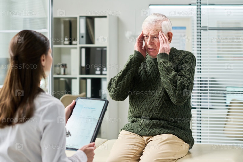 Старший мужчина прикасается к голове во время консультации с женщиной-врачом в клинике