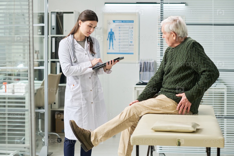 Молодая женщина-врач, осматривающая старшего мужчину в клинике