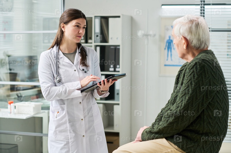 Женщина-врач обсуждает результаты тестов с молодым старшим мужчиной