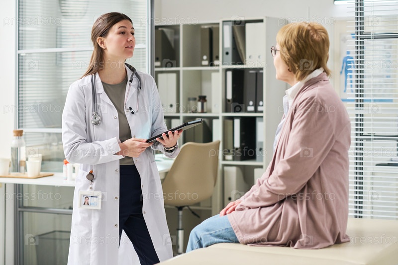 Молодая женщина-врач обсуждает диагноз со старшей женщиной