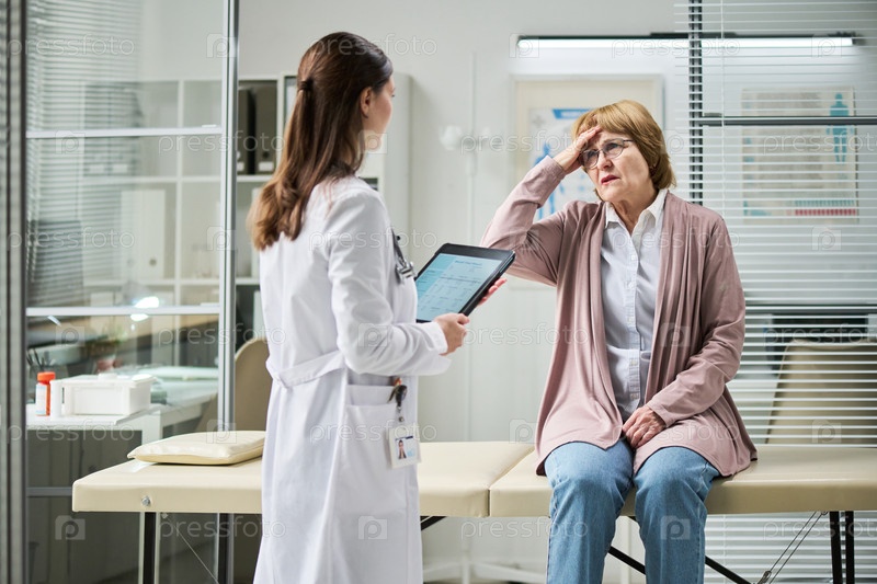 Старшая женщина консультирует женщину-врача о симптомах головной боли