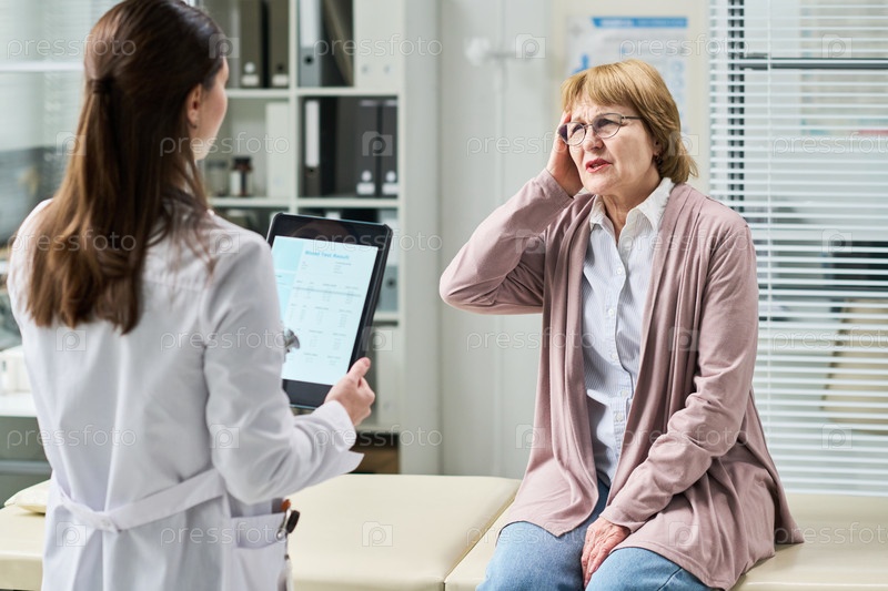 Старшая женщина описывает симптомы головной боли женщине-врачу в клинике