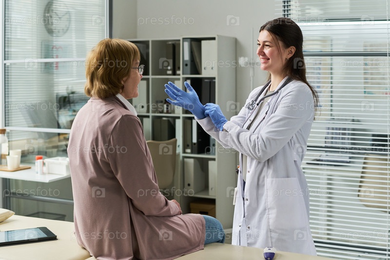 Молодая женщина-врач улыбается, надевая перчатки рядом со взрослой женщиной