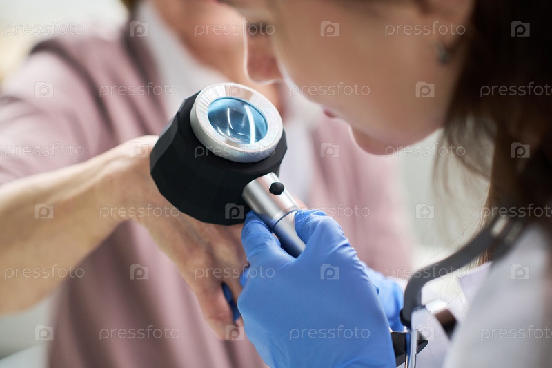 Женщина-врач, осматривающая старшую женскую руку с помощью дерматоскопа