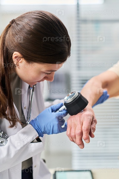 Молодая женщина-врач, осматривающая руку старшего пациента мужского пола