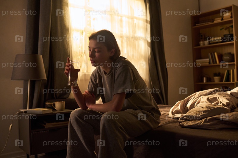 Молодая женщина сидит на кровати, пьет воду в утреннем солнечном свете