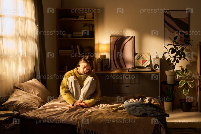 Молодая женщина сидит на кровати, обнимает колени в солнечной спальне
