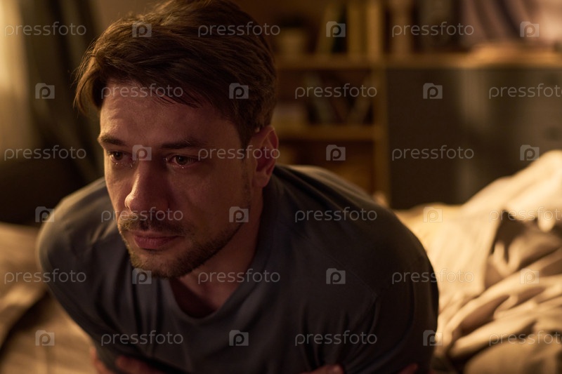 Портрет молодого человека, сидящего на кровати и выглядящего в отчаянии