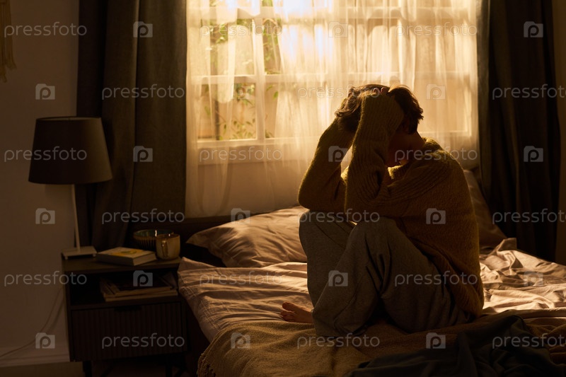 Молодая женщина сидит на кровати, держит голову в руках и чувствует стресс