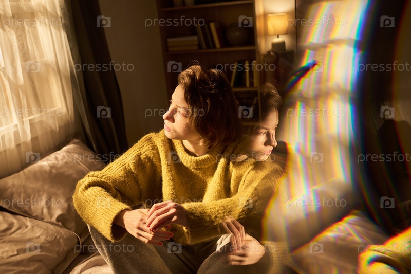 Молодая женщина сидит на кровати, отражающая свет окна в помещении