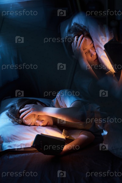 Молодая женщина лежит в постели, читает смартфон и выглядит напряженной