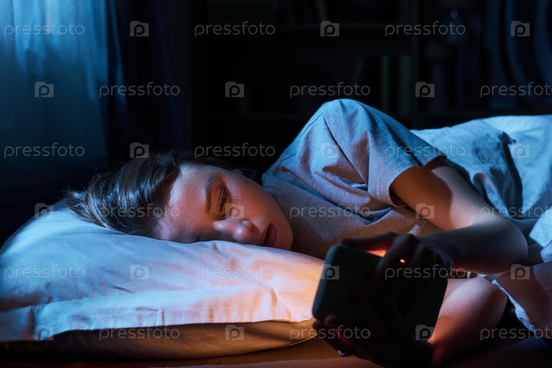 Девушка-подросток, лежащая в постели и использующая смартфон ночью