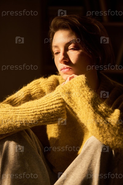 Портрет молодой женщины, сидящей и расслабляющейся под теплым солнечным светом