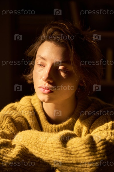 Портрет молодой женщины, сидящей в помещении и отражающей солнечный свет