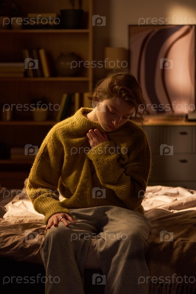 Молодая женщина сидит на кровати, появляясь глубоко в мыслях