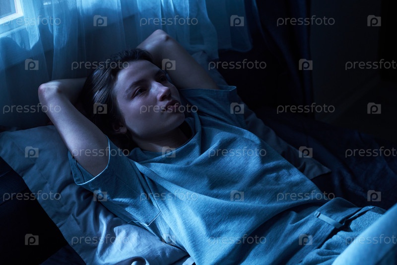 Молодая женщина лежит на кровати, отражаясь в слабо освещенной спальне