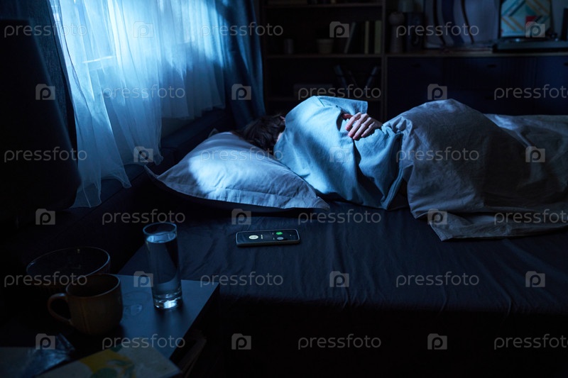 Молодая женщина спит в постели со смартфоном на ночном столе