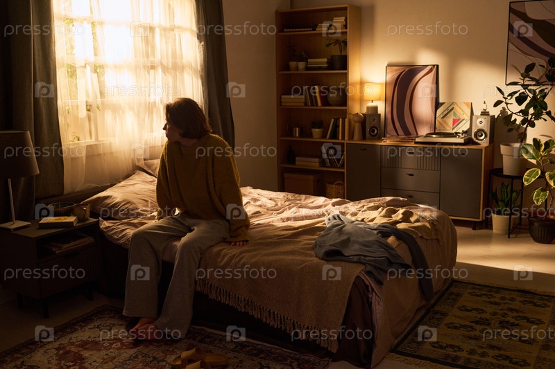 Молодая женщина сидит на кровати, отражаясь в уютной солнечной спальне