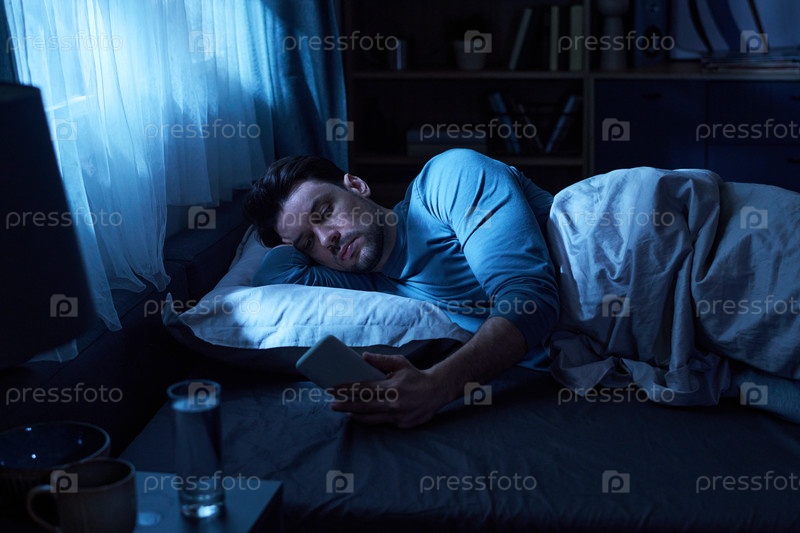 Молодой человек, лежащий в постели и использующий смартфон ночью