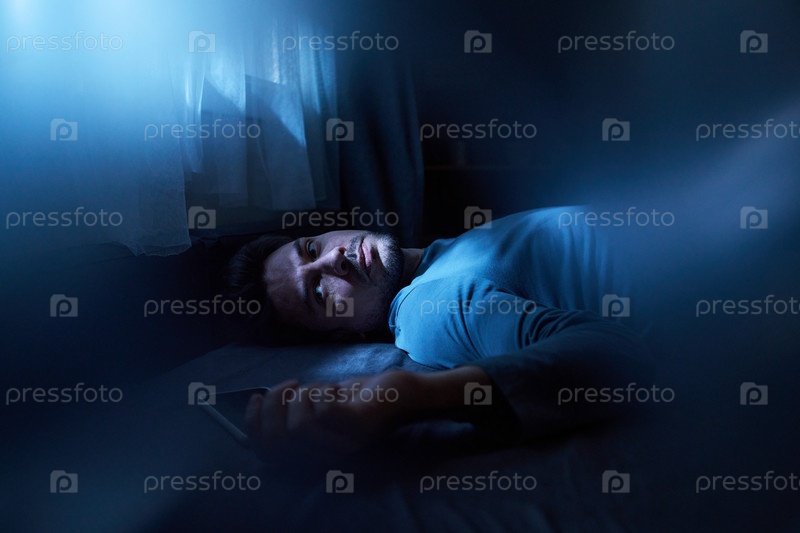 Молодой человек, лежащий в постели и держащий смартфон ночью