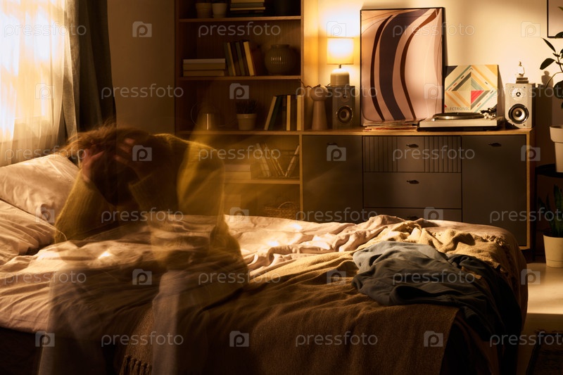 Молодая женщина сидит на кровати, держа голову в тускло освещенной комнате