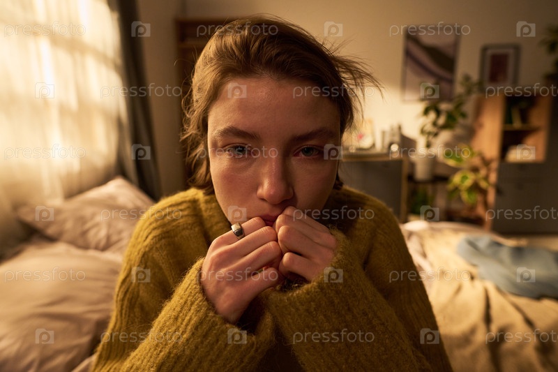 Портрет молодой женщины, сидящей в помещении и кажущейся огорченной