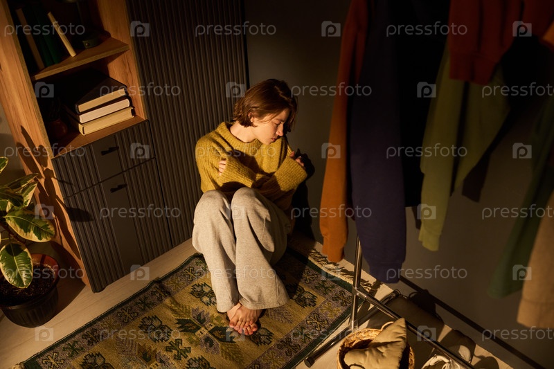 Молодая женщина сидит одна на полу, чувствуя себя грустной и изолированной