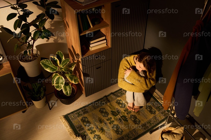 Молодая женщина сидит одна на полу, обнимает колени и чувствует беспокойство