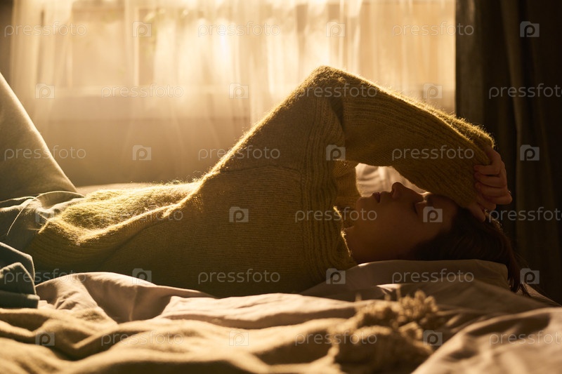 Молодая женщина отдыхает на кровати в солнечной комнате, покрывая лицо рукой