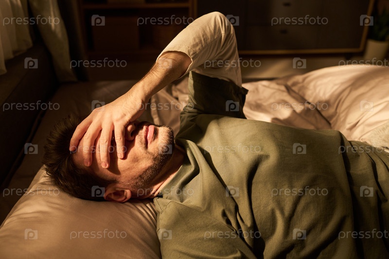 Молодой человек лежит в постели, закрывая лицо рукой утром