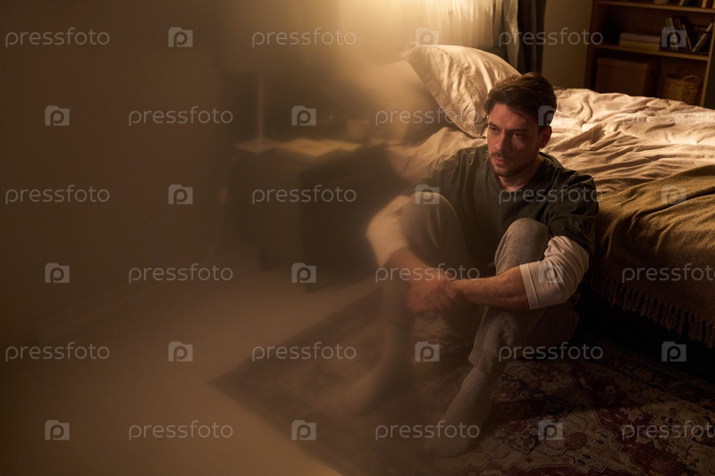Молодой человек сидит один на полу, отражая в спальне