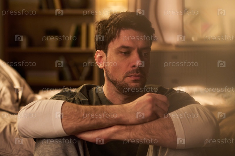 Молодой человек сидит один, отражая себя в уютном домашнем интерьере