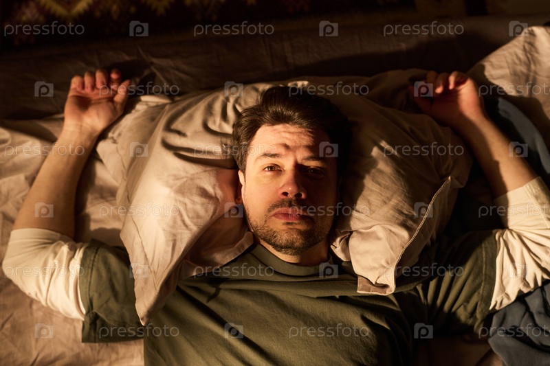 Портрет молодого человека, лежащего бодрствующим в постели и смотрящего вверх