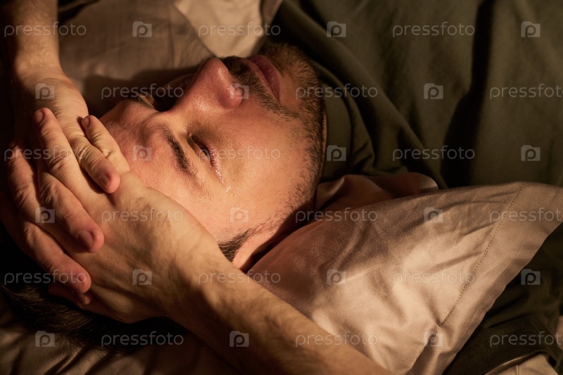 Взрослый мужчина лежит в постели, держа голову и выглядит подавленным