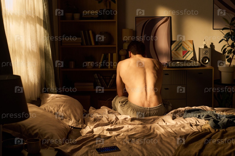 Молодой человек сидит на кровати, отражая утренний солнечный свет