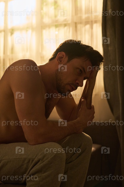 Молодой человек, сидящий один, появляется глубоко в мыслях внутри дома