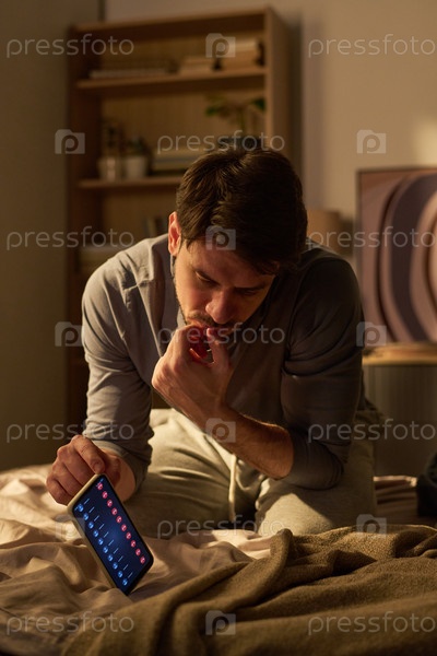 Молодой человек сидит на кровати, проверяет уведомления о смартфоне ночью