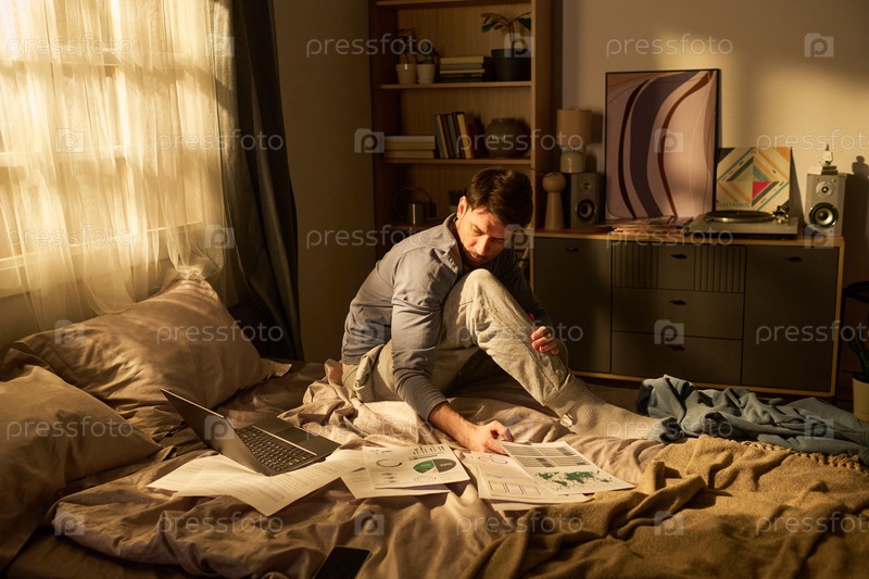 Молодой человек сидит на кровати, анализируя финансовые документы дома