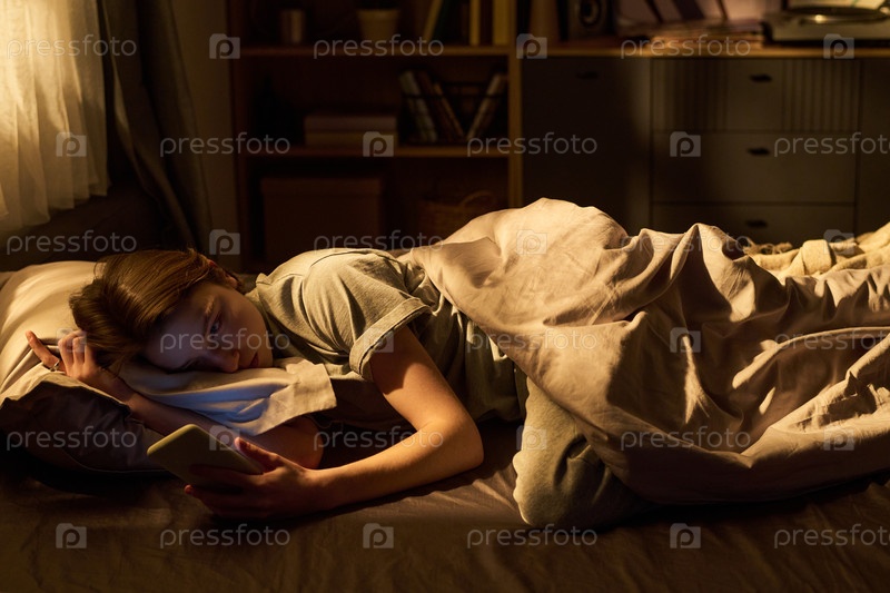 Молодая женщина, лежащая в постели с помощью планшетного устройства ночью