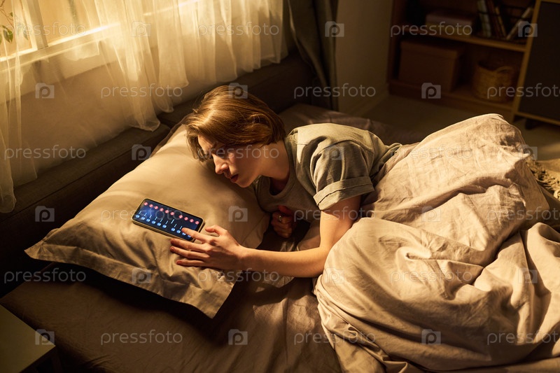 Молодая женщина, лежащая в постели и достигающая экрана смартфона